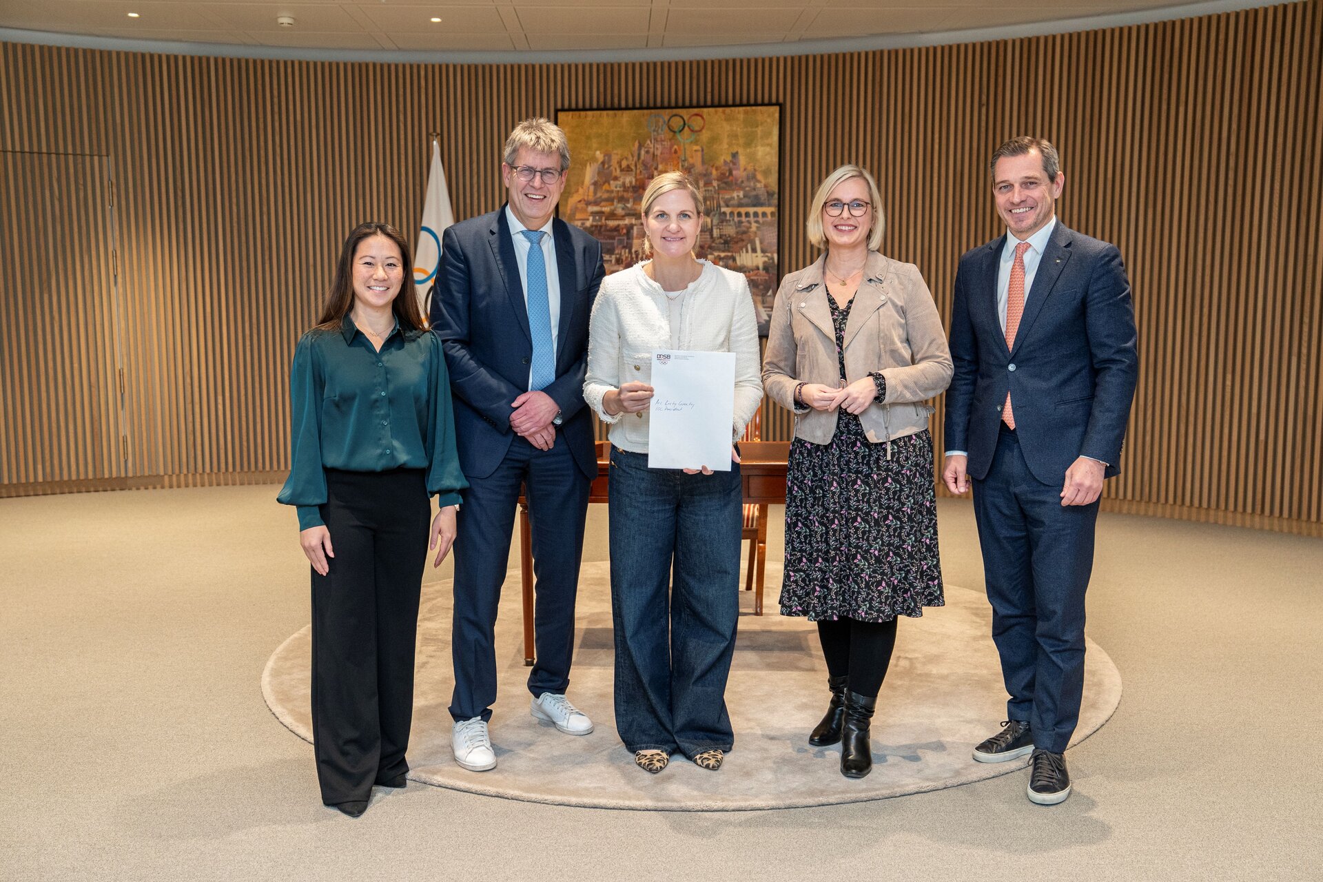 Anschließend stieß zum zentralen Tagesordnungspunkt die Staatsministerin für Sport und Ehrenamt, Christiane Schenderlein (CDU), mit zwei Mitarbeitenden zur DOSB-Delegation hinzu, um IOC-Präsidentin Kirsty Coventry in Person von Thomas Weikert den offiziellen Brief zu übergeben, mit dem die Aufnahme des Continuous Dialogue beantragt wird. Eine mündliche Bestätigung gab es direkt, eine schriftliche wird folgen. Coventry nahm sich insgesamt zwei Stunden Zeit für den gemeinsamen Austausch. „Olympische und Paralympische Spiele nach Deutschland zu holen, ist unser wichtigstes sportpolitisches Ziel. Warum wir das wollen und dass wir an den Erfolg einer deutschen Bewerbung glauben, konnte ich der IOC-Präsidentin im persönlichen Austausch heute näher begründen“, sagte Schenderlein. Zum Abschluss des offiziellen Termins genoss die deutsche Gruppe noch eine Führung durch das Olympic House.